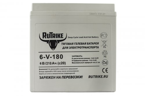 Зарядка должна осуществляться оригинальным зарядным устройством Rutrike, или проверенным, соответствующим характеристикам устройством заводского изготовления в соответствии с инструкцией к этому зарядному устройству и требованиями к напряжению и силе тока. Зарядное устройство должно быть импульсным, полностью автоматическим, с функцией десульфатации пластин, специально предназначенное для тяговых аккумуляторных батарей.