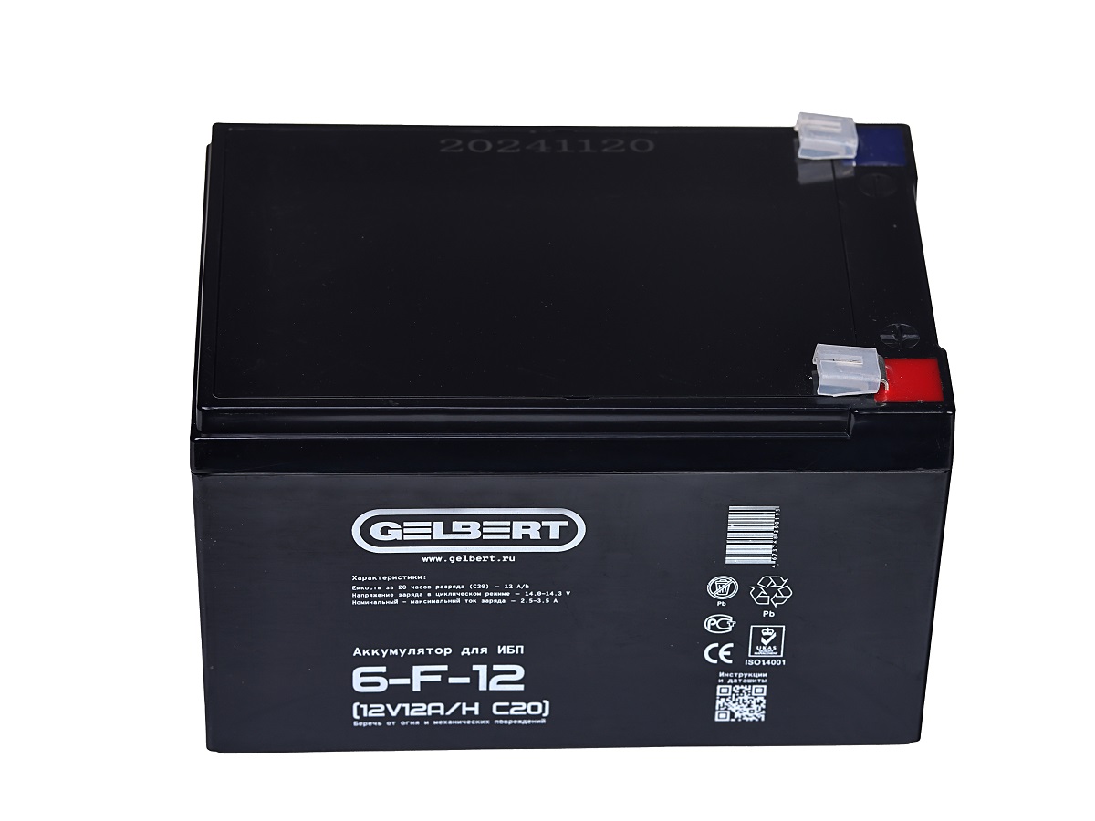 Аккумуляторная батарея Gelbert 6-F-12 выполнена по технологии AGM и состоит из утолщённых свинцовых пластин и плотного слоя сепаратора между ними. Батарея не требует обслуживания на протяжении всего цикла эксплуатации. Отлично подходит для работы в системах безопасности и сигнализации, системах бесперебойного питания, системах аварийного освещения, в лёгком и детском электротранспорте и в других схожих сферах применения.