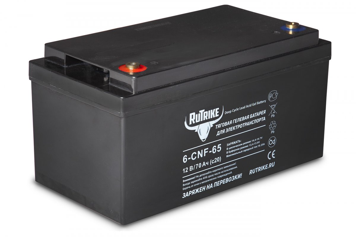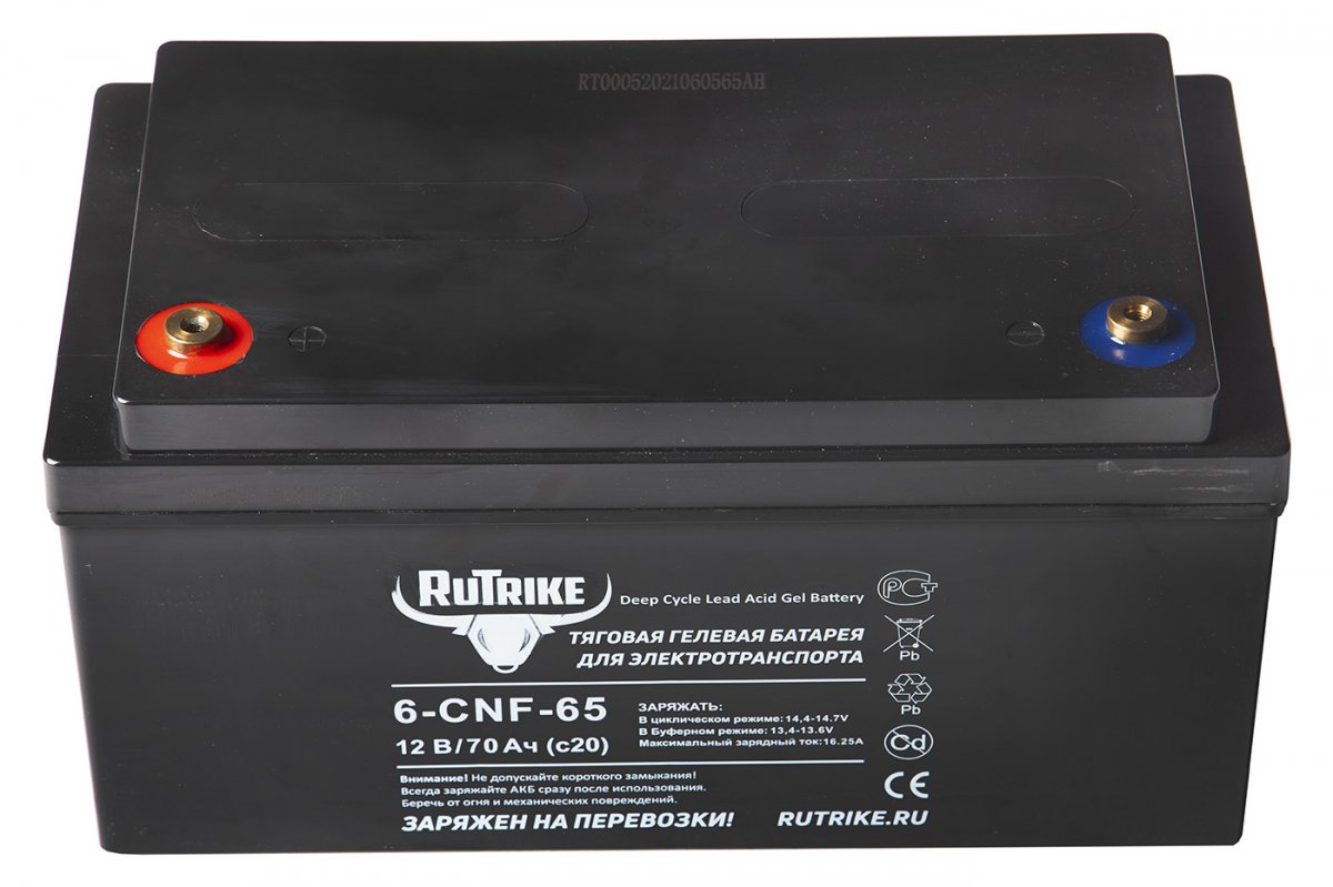 Зарядка должна осуществляться оригинальным зарядным устройством Rutrike, или проверенным, соответствующим характеристикам устройством заводского изготовления в соответствии с инструкцией к этому зарядному устройству и требованиями к напряжению и силе тока. Зарядное устройство должно быть импульсным, полностью автоматическим, с функцией десульфатации пластин, специально предназначенное для тяговых аккумуляторных батарей.
