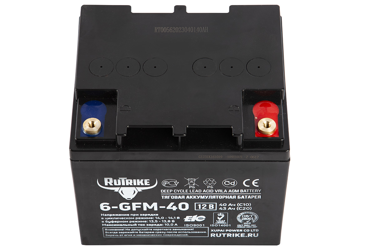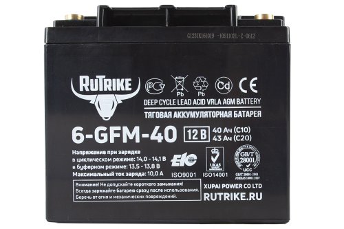 Зарядка должна осуществляться оригинальным зарядным устройством Rutrike, или проверенным, соответствующим характеристикам устройством заводского изготовления в соответствии с инструкцией к этому зарядному устройству и требованиями к напряжению и силе тока. Зарядное устройство должно быть импульсным, полностью автоматическим, с функцией десульфатации пластин, специально предназначенное для тяговых аккумуляторных батарей.