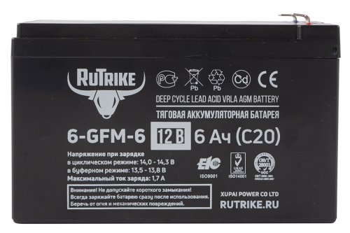 Зарядка должна осуществляться оригинальным зарядным устройством Rutrike, или проверенным, соответствующим характеристикам устройством заводского изготовления в соответствии с инструкцией к этому зарядному устройству и требованиями к напряжению и силе тока. Зарядное устройство должно быть импульсным, полностью автоматическим, с функцией десульфатации пластин, специально предназначенное для тяговых аккумуляторных батарей.