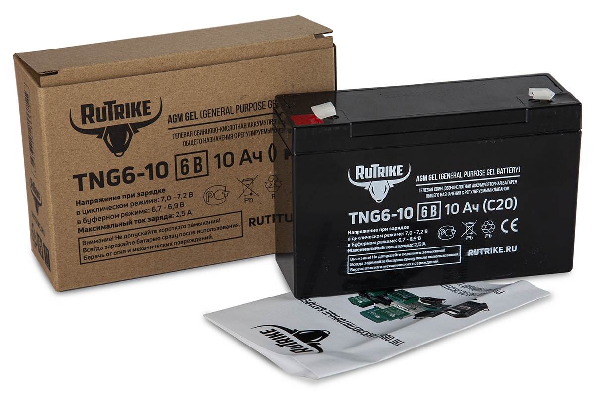 Тяговый аккумулятор RuTrike TNG6-10 (6V10A/H C20) - это 6-вольтовая аккумуляторная батарея изготовленная с использованием технологии GEL AGM (Absorbent Glass Mat + густой электролит внутри стекловолоконного сепаратора), что делает ее идеальной для использования в качестве основного или резервного источника питания в различных сферах применения, таких как: