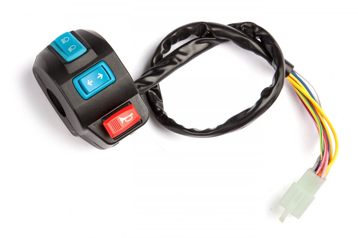 Левый рулевой блок переключателей на грузовых электрических трициклах отвечает за переключение головного света и включение поворотных сигналов. Также в нижней части блока расположена кнопка звукового сигнала. Блок переключателей выполнен из качественного пластика и является оригинальной запасной частью, произведённой компании Eltreco.