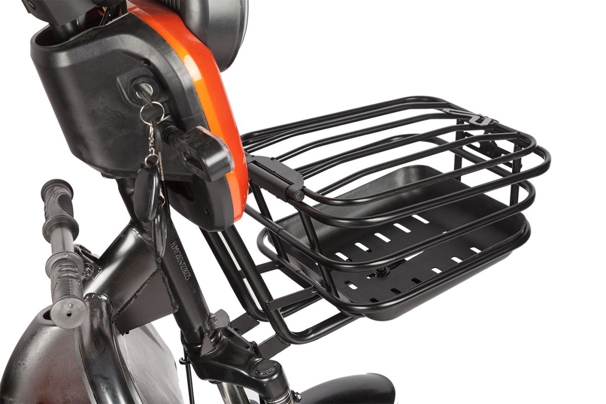 Трицикл Rutrike Gelbert CAF имеет конструкцию-трансформер: под сиденьем водителя скрывается вместительная металлическая корзина, а ещё одна расположена спереди, на руле.