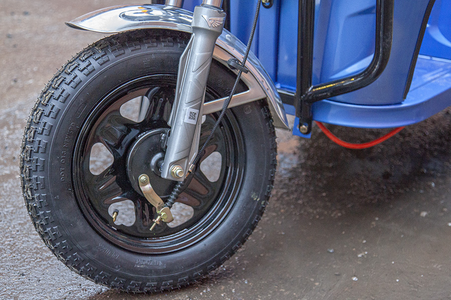 Электрический скутер-трицикл оснащён вместительным кузовом габаритами 1500 x 1050 x 330 мм (Д х Ш х В). Переднее и заднее колёса диаметром 12" комплектуются покрышками с развитыми грунтозацепами. В процессе езды электрический трицикл обладает повышенной устойчивостью и хорошей манёвренностью даже в груженом состоянии. На трицикле штатно установлена противоугонная сигнализация.