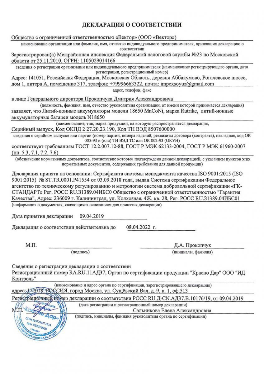 | Срок службы в циклическом режиме: заряд/разряд | Не менее 1000 циклов | |
