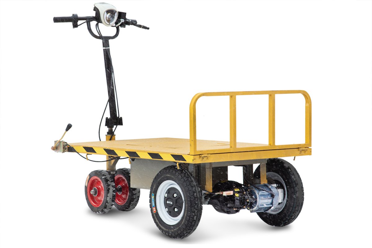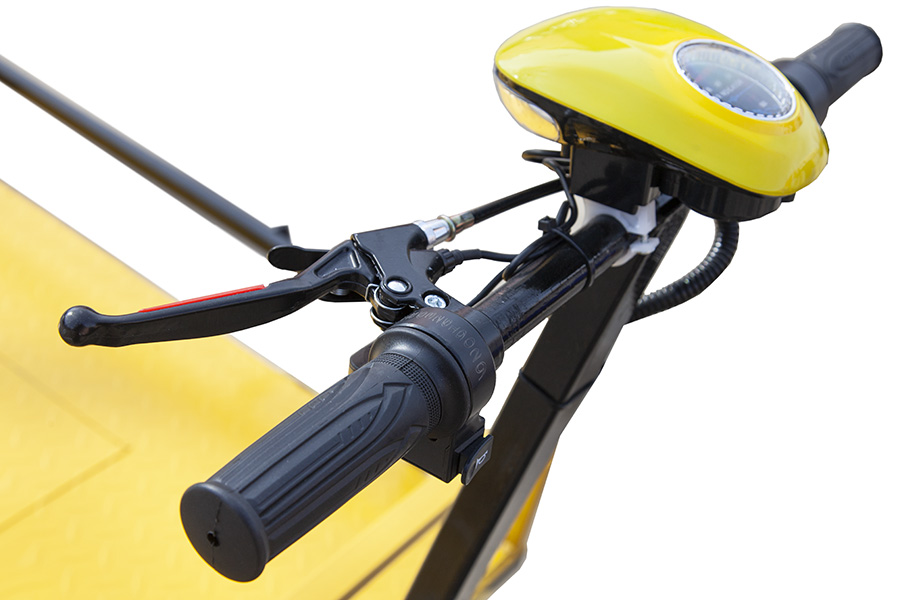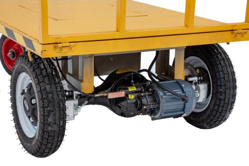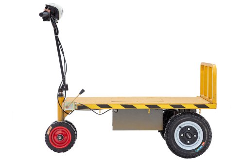 Руль мотоциклетного типа позволяет оператору удобно и безопасно осуществлять управление тележкой. А возможность переключения на пониженную передачу делает возможным передвижение с максимальной загрузкой на подъём и по сложному рельефу местности, учитывая прекрасную тяговитость бесщёточного редукторного электромотора мощностью 800 Вт.