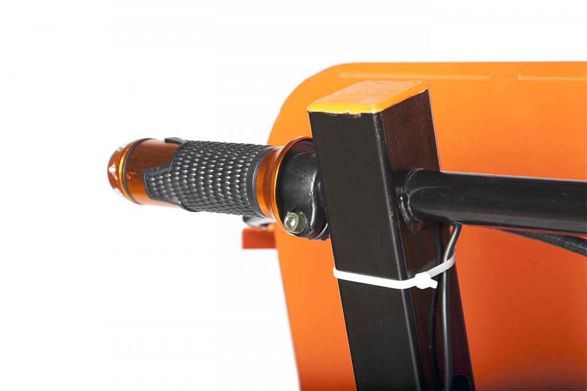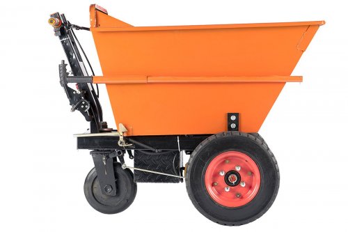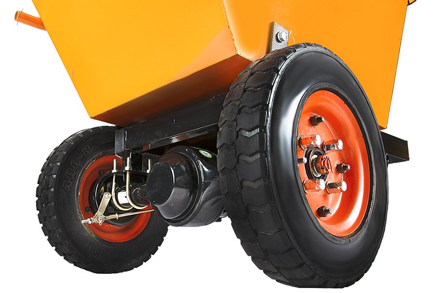 - на одном заряде батареи устройство может проезжать до 30 км, двигаясь со скоростью 8 км/ч. Три колеса обеспечивают тачке устойчивость и маневренность. Имеет передний привод. У всей нашей строительной техники есть рекуперация и активное торможение двигателем. Это позволяет с грузом комфортно спускаться и двигаться на подъём;