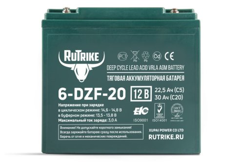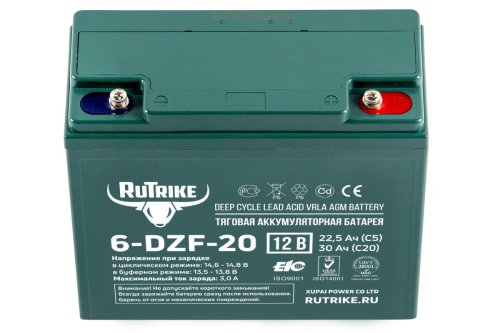 Необслуживаемая аккумуляторная батарея Rutrike 6-DZF-20 с системой рекомбинации газов (VRLA) произведена по технологии AGM. Батарея выполнена по технологии внутреннего формования. В толстых свинцовых пластинах используется экологичный сплав без кадмия и мышьяка.