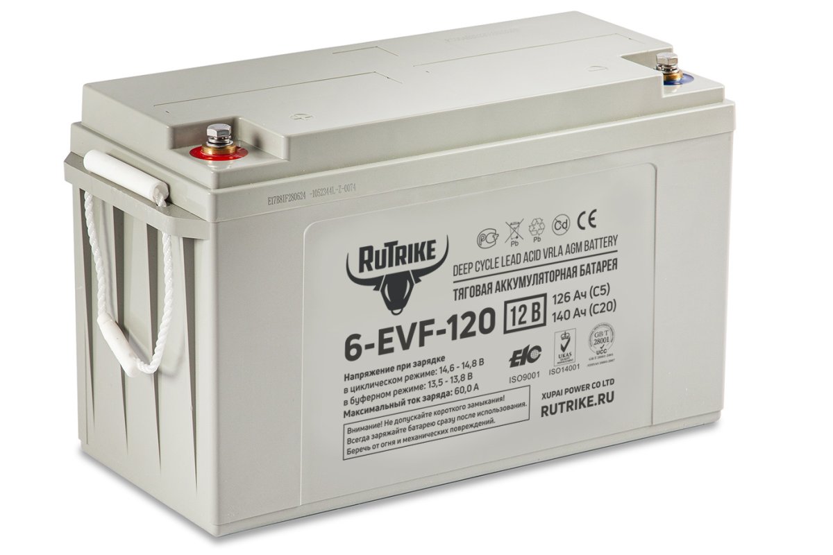Rutrike 6-EVF-120 — необслуживаемая аккумуляторная батарея с системой рекомбинации газов (VRLA) произведённая по технологии AGM. Батареи выполнены по технологии внутреннего формования. В свинцовых пластинах, имеющих большую толщину по сравнению со стандартными аккумуляторами, используется экологичный запатентованный сплав без кадмия и мышьяка. Плотный сепаратор из углеволокна пропитан электролитом, изготовленным по технологии NANO GEL. Электролит находится в сгущенном состоянии, не даёт утечек и не требует долива воды на протяжении всего срока эксплуатации.