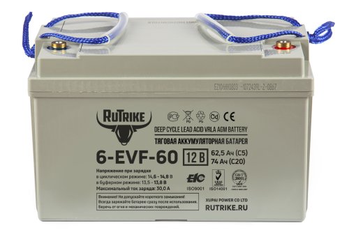 Rutrike 6-EVF-60 - необслуживаемая аккумуляторная батарея с системой рекомбинации газов (VRLA) произведенная по технологии AGM. Батареи выполнены по технологии внутреннего формования. В свинцовых пластинах, имеющих большую толщину по сравнению со стандартными аккумуляторами, используется экологичный запатентованный сплав без кадмия и мышьяка. Плотный сепаратор из углеволокна пропитан электролитом, изготовленным по технологии NANO GEL. Электролит находится в сгущенном состоянии, не даёт утечек и не требует долива воды на протяжении всего срока эксплуатации.
