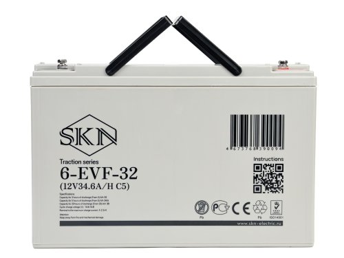 SKN 6-EVF-32 – это необслуживаемая аккумуляторная батарея, изготовленная по технологии AGM с системой рекомбинации газов (VRLA). Батарея произведена с использованием технологии внутреннего формования. В её свинцовых пластинах, которые имеют увеличенную толщину по сравнению со стандартными аналогами, применяется экологичный запатентованный сплав, не содержащий кадмия и мышьяка. Сепаратор из плотного углеволокна пропитан электролитом, созданным по технологии NANO GEL. Электролит находится в сгущенном состоянии, что исключает утечки и необходимость долива воды на протяжении всего срока службы.